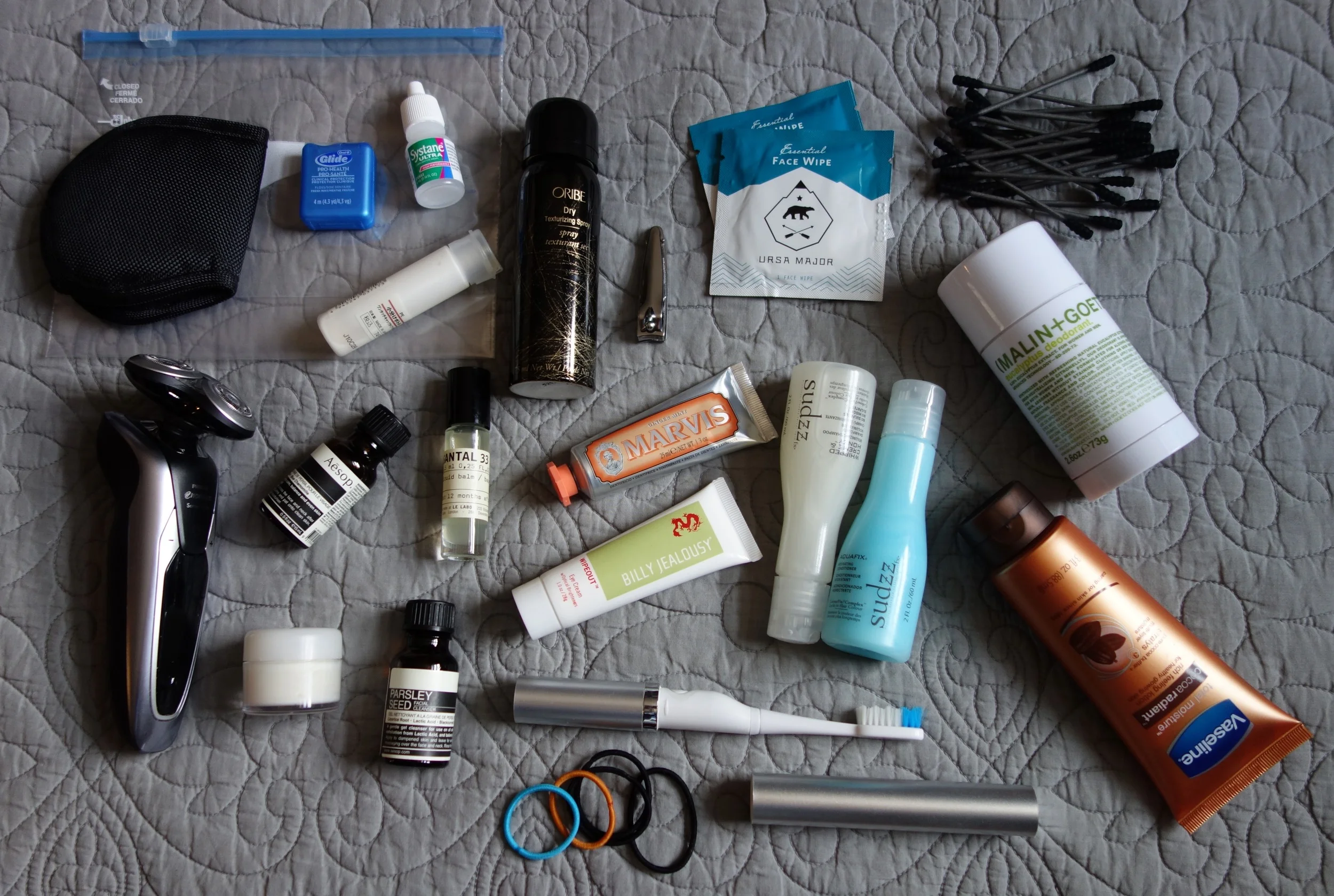 I like to use my guest bed as a staging area, laying everything out so that I can make sure I did not miss anything and so that I can decide the proper bag to pack it in.